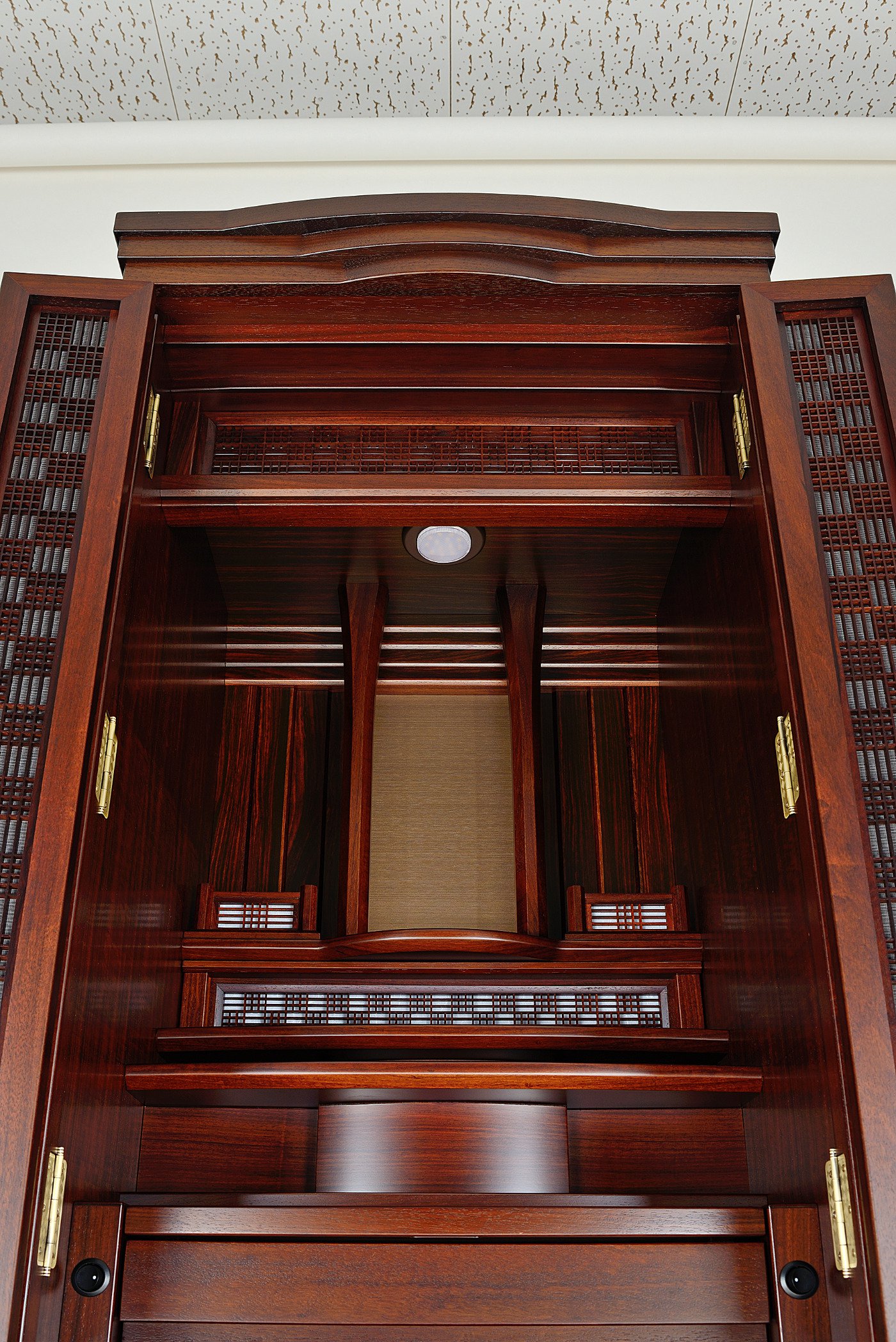全てを家具調化するのではなく、一部に伝統的組子の技法を残したり、あえて障子や宮殿柱の名残を残す事で仏壇の持つ独特の「格式と尊厳さ」を保ちつつも、現在の空間にも充分溶け込めるデザインを意識した作品です