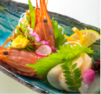 | 御造里 | お選びいただけます 〈A〉勘八、鮪、サーモン、烏賊、甘海老 〈B〉サーモンと鯛のサラダ仕立て レモン添え 〈C〉有頭海老、鮪、烏賊 |