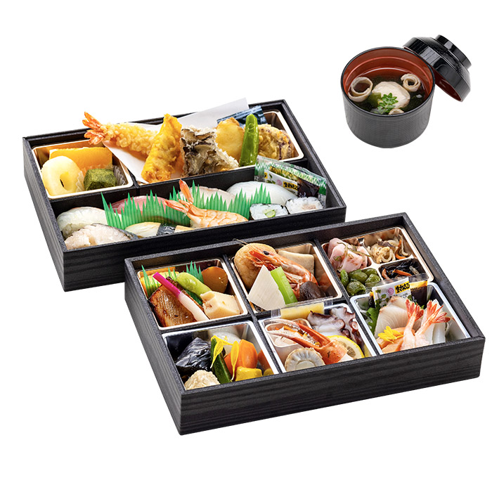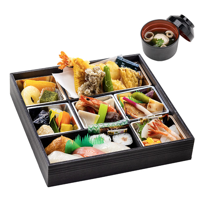 紋甲イカお造里、サーモンお造里、カンパチお造里、マグロお造里、鶏松風、わかさぎ・竹の子・枝豆、鴨ロース・さつま芋、五目豆、ホタテ貝・若芽、稲荷寿司、鉄火巻、タコ・赤貝・若芽、サーモン手毬寿司、鯛手毬寿司、マグロ手毬寿司、イカ手毬寿司 ※ 賞味期限は配達日当日です。 |