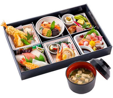| 御飯物 | 握り寿司三種、稲荷盛り合せ |