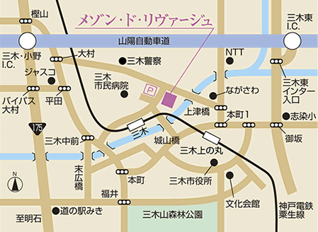 「三木上の丸」駅下車。北へ「美嚢川(みのうがわ)」の上津橋を渡り、信号交差点の手前左手にございます。