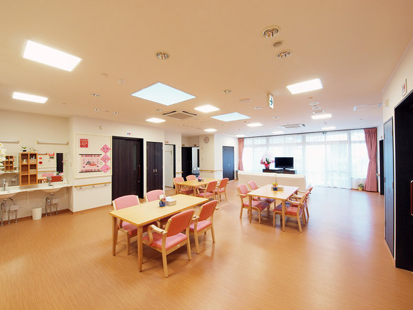 ピンク色を基調とした清潔で明るい雰囲気のデイルーム