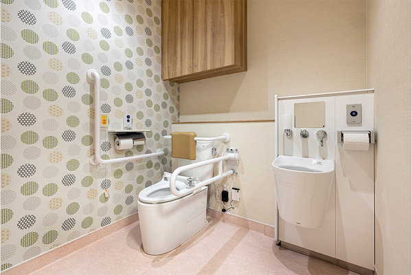 多目的トイレ 広めの作りで車いすの方も快適にご利用していただけます。オストメイトも設置しています。