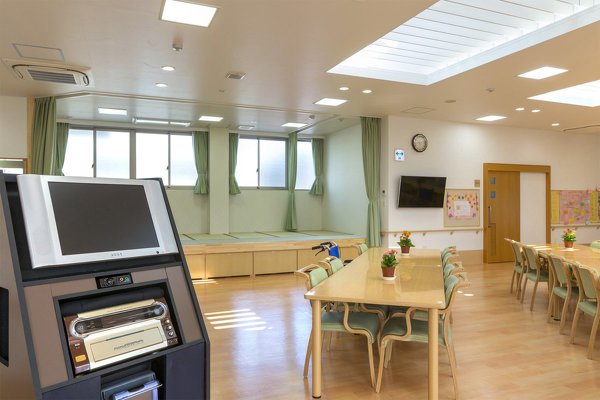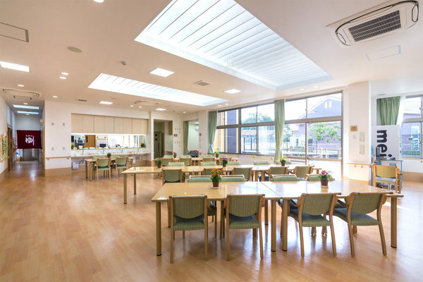天窓から柔らかい光が降りそそぐ温かな雰囲気のデイルーム。