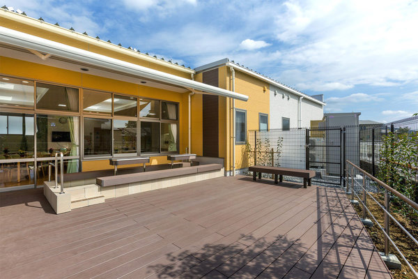 ウッドデッキで歩行訓練や足湯を楽しめます