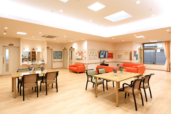 天窓から自然の光が降り注ぐ明るいデイルーム。