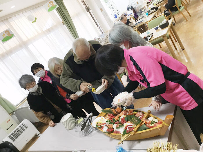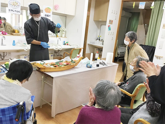 桜がようやく咲き始めた4月3日、バイキング昼食付内覧会を開催致しました。 新鮮な魚を船盛りにしたり、繊細な包丁さばきで飾り切りをする様を目の前で見た時は拍手と歓声が沸き起こりました。