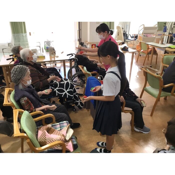 11月23日(土)小宅小学校の音楽会にご招待頂きました。 1学年100名以上の生徒さんの元気な歌声と見事な演奏に利用者様も感動されていました。 後日、6年生3名の生徒さんが授業の一貫でふれあい交流会として来所して下さり、防災対策について紙芝居仕立で分かりやすく伝えてくれたので利用者様にしっかり伝わりました。 そのあとはお手玉・おはじき・けん玉を使って昔遊びで盛り上がりました。 お互いに教えあったり、競ったりで利用者様も童心に還り楽しい時間を過ごす事が出来ました。