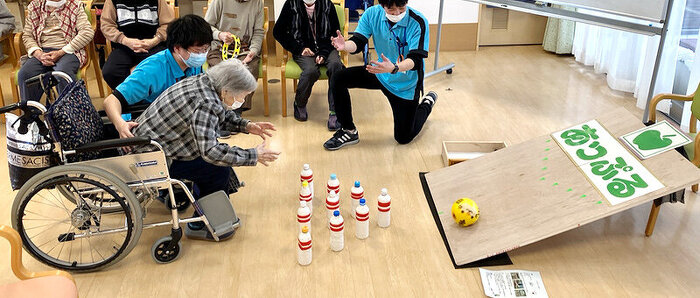 2月14日にデイサービス明石・明石西・加古川の利用者様と合同で、リバースボウリング大会を行いました。 通常のボウリングでは無く、斜めに立てかけたスロープにボールを投げ、その勢いでピンを倒すレクリエーションです。 3チームに分かれ、タンバリンや掛け声で応援していただき、非常に盛り上がりました。 結果は「引き分け」になりましたが、「次も参加したい!」と大盛況で終了しました。