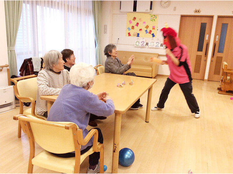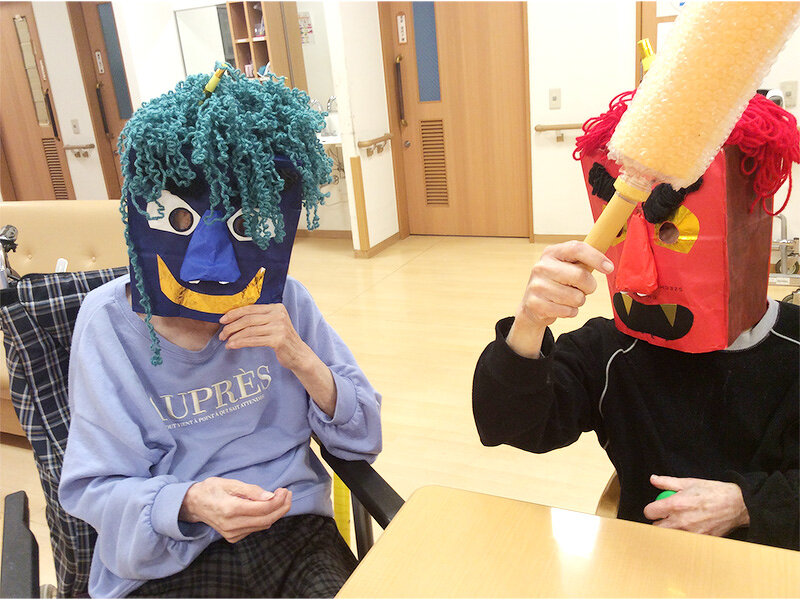 2月2日(日)節分の豆まきを実施しました。 職員が鬼となりご利用者様のもとへ勢いよく登場しました! 最初は「わぁ~怖い!」と少し怖がっておられましたが、いつもの職員の声がすると袋に入った福豆を鬼に向かって一目散に投げられ「鬼は~外~あっちいけ!」と元気よく豆まきされ、とても賑やかな時間となりました。 また毎年恒例の117グループ冠婚部が作った福巻を今年も召し上がっていただきました。 「色合いが綺麗ねぇ」「大きくて具がたっぷりでおいしい~」と皆さまとても喜んでいただきました。