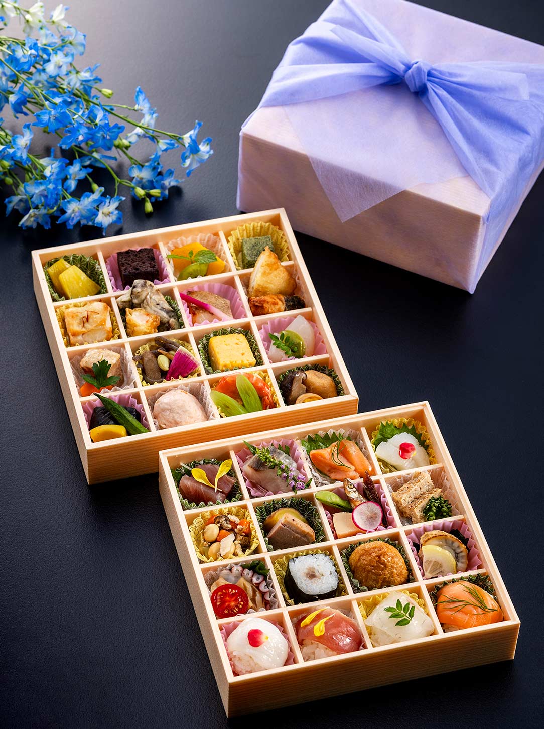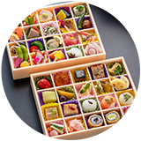 紋甲イカお造里、サーモンお造里、カンパチお造里、マグロお造里、鶏松風、わかさぎ・竹の子・枝豆、鴨ロース・さつま芋、五目豆、ホタテ貝・若芽、稲荷寿司、鉄火巻、タコ・赤貝・若芽、サーモン手毬寿司、鯛手毬寿司、マグロ手毬寿司、イカ手毬寿司 ※ 賞味期限はお渡し日当日です。 |