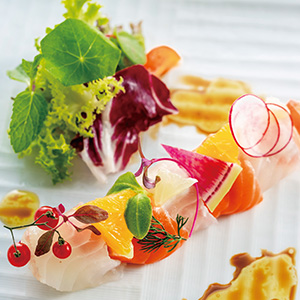 | 御造里 | お選びいただけます 〈A〉勘八、鮪、サーモン、烏賊、甘海老 〈B〉サーモンと鯛のサラダ仕立て レモン添え 〈C〉有頭海老、鮪、烏賊 |