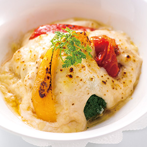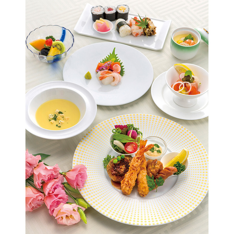 | 焼物 | お選びいただけます 〈D〉鰆の味噌漬け焼き 酢橘を添えて 〈E〉鰈と野菜のグラタン ボンファム仕立て 〈F〉サーモンと旬野菜の田楽 朴葉焼き |