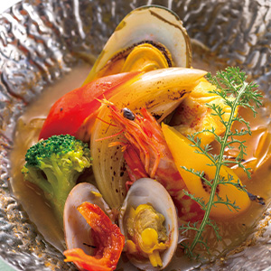 | 鍋物 | お選びいただけます 〈G〉鯛のしゃぶしゃぶ ポン酢を添えて 〈H〉海の幸のブイヤベース 〈I〉鴨とつくねの味噌鍋仕立て |