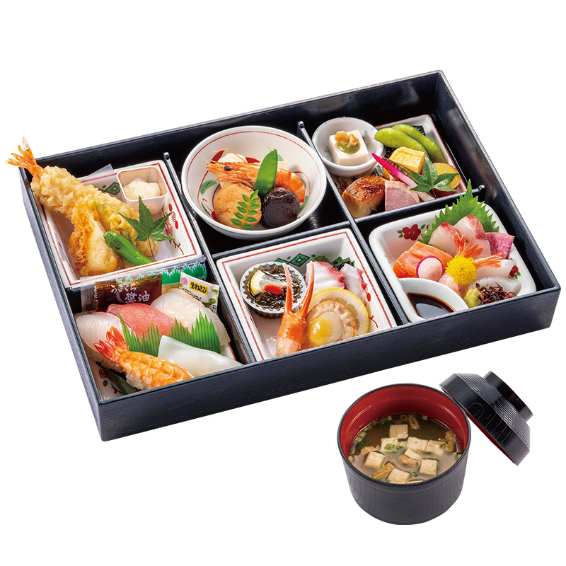 | 御飯物 | 握り寿司三種、稲荷盛り合せ |