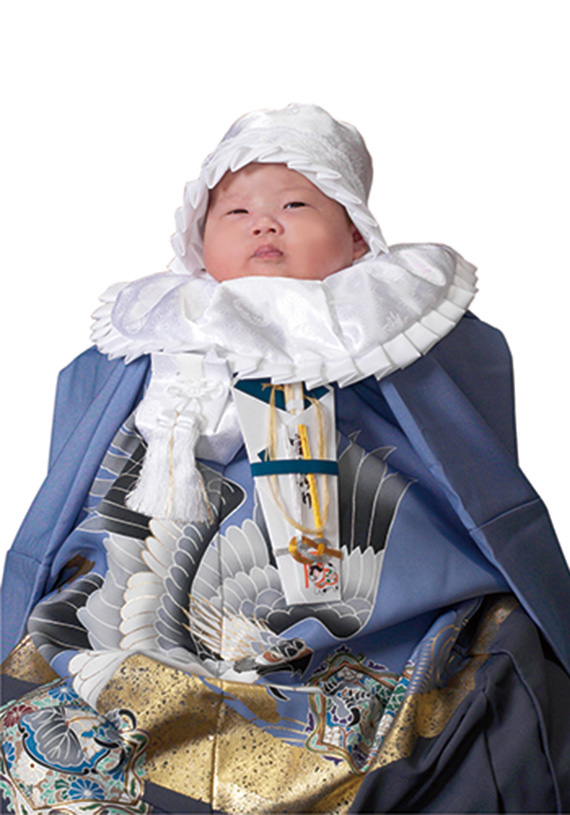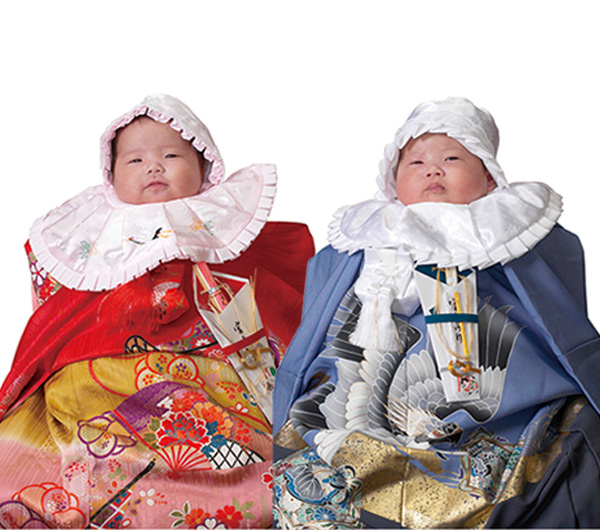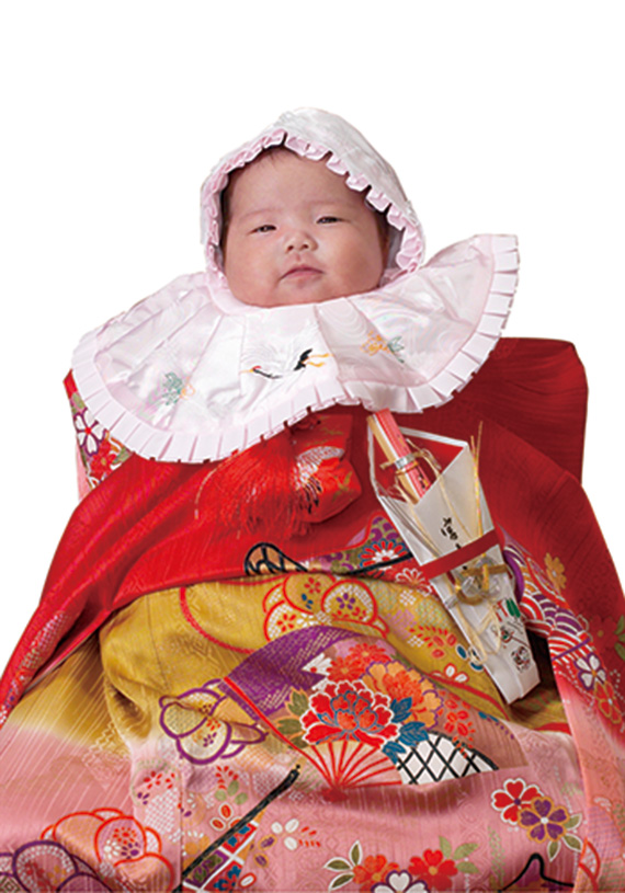 お宮参りは生後一ヶ月頃に神社に参拝し、赤ちゃんの誕生を祝い、健康と長寿を祈ります。正式には男の子は生後31日目、女の子は生後32日目ですが、お天気、お日柄が良く、ご家族のご都合の良い日を選ぶと良いでしょう。肌着の上に白羽二重の内着を着せ、その上から晴れ着を羽織らせ、赤ちゃんを抱いた状態で、付けヒモを結びます。
