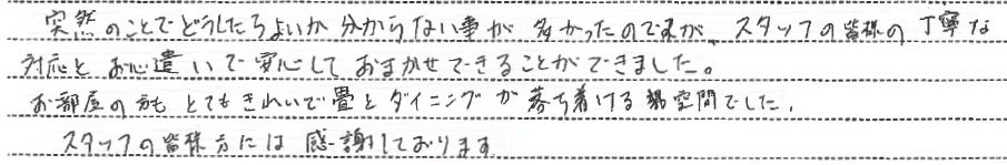 突然のことでどうしたらよいか分からない事が多かったのですが、スタッフの皆様の丁寧な対応とお心遣いで安心しておまかせすることができました。