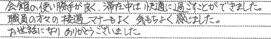 会館の使い勝手が良く、滞在中は快適に過ごすことができました。