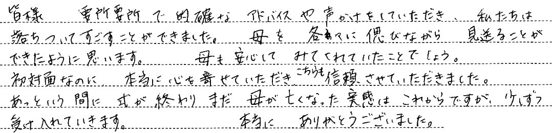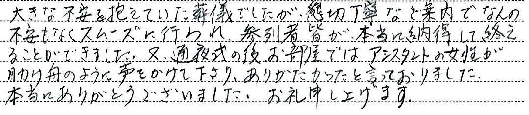 大きな不安を抱えていた葬儀でしたが、懇切丁寧なご案内でなんの不安もなくスムーズに行われ、参列者皆が本当に納得して終えることができました。
