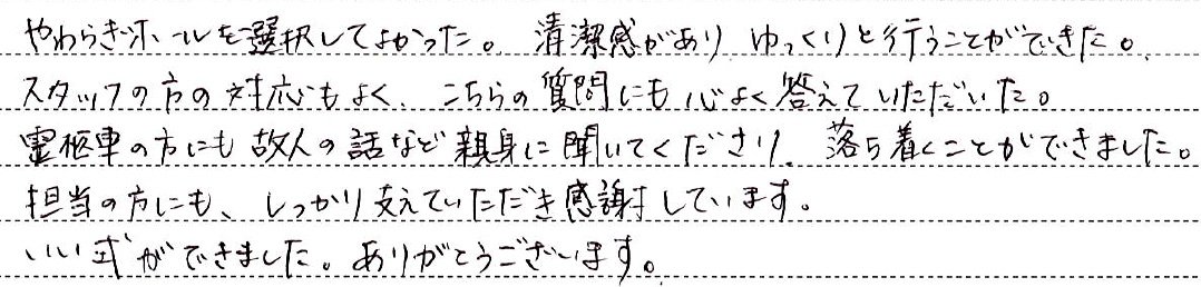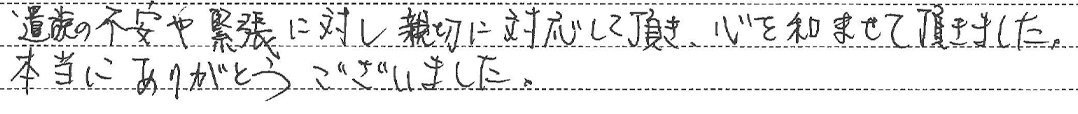 遺族の不安や緊張に対し親切に対応して頂き、心を和ませて頂きました。