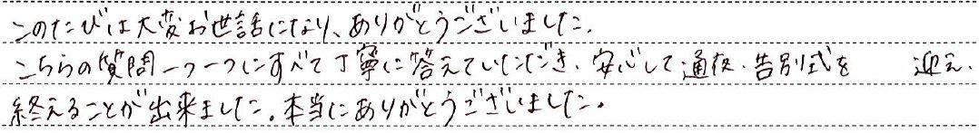 こちらの質問一つ一つにすべて丁寧に答えていただき、安心して通夜・告別式を迎え、終えることが出来ました。