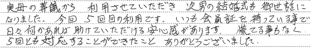 実母の葬儀から 利用させていただき 次男の結婚式も御世話になりました。今回 5回目の利用です。