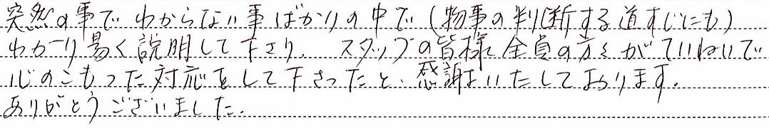 突然の事で、わからない事ばかりの中で(物事の判断する道筋にも)わかり易く説明してくださり、スタッフの皆様全員の方々がていねいで心のこもった対応をしてくださったと感謝しております。