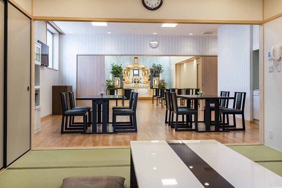 ご自宅のような雰囲気でゆっくりとお別れがしたいとお考えの方には、親族室でご葬儀を執り行うこともできます。各親族室には和室、食事室、ご遺族仮眠室やバスルーム、トイレも備えてあり、ゆったりとお過ごしいただけます。ご遺族の皆様の大切な想いを取り入れた、さまざまなご葬儀を真ごころを込めてお手伝いさせていただきます。
