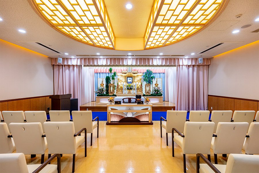 天井が高く明るく開放的なホール。 ゆったりとお過ごしいただける親族室。