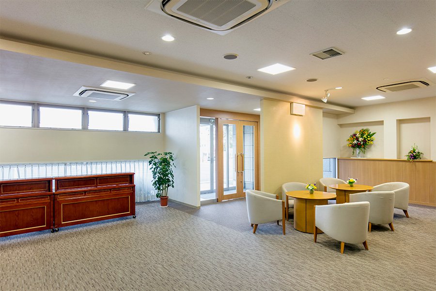 天井が高く明るく開放的なホール。 ゆったりとお過ごしいただける親族室。