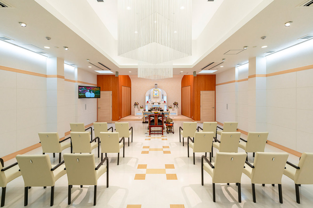 天井が高く明るく開放的なホール。ゆったりとお過ごしいただける親族室。