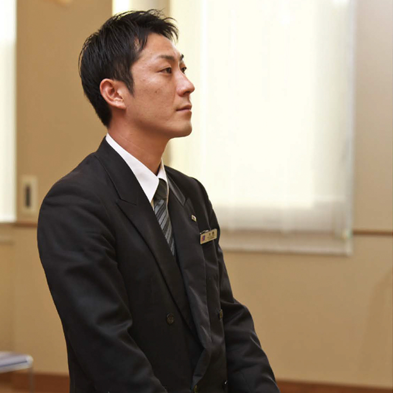 新卒で117グループに入社し、営業やブライダルの研修も受けましたが、ぜひ大和会館で葬儀の仕事をしたいと強く希望し、飾磨大和会館に勤務することとなりました。飾磨で5年、2年前に龍野大和会館に異動。昨年には一級葬祭ディレクターの資格も取得しました。