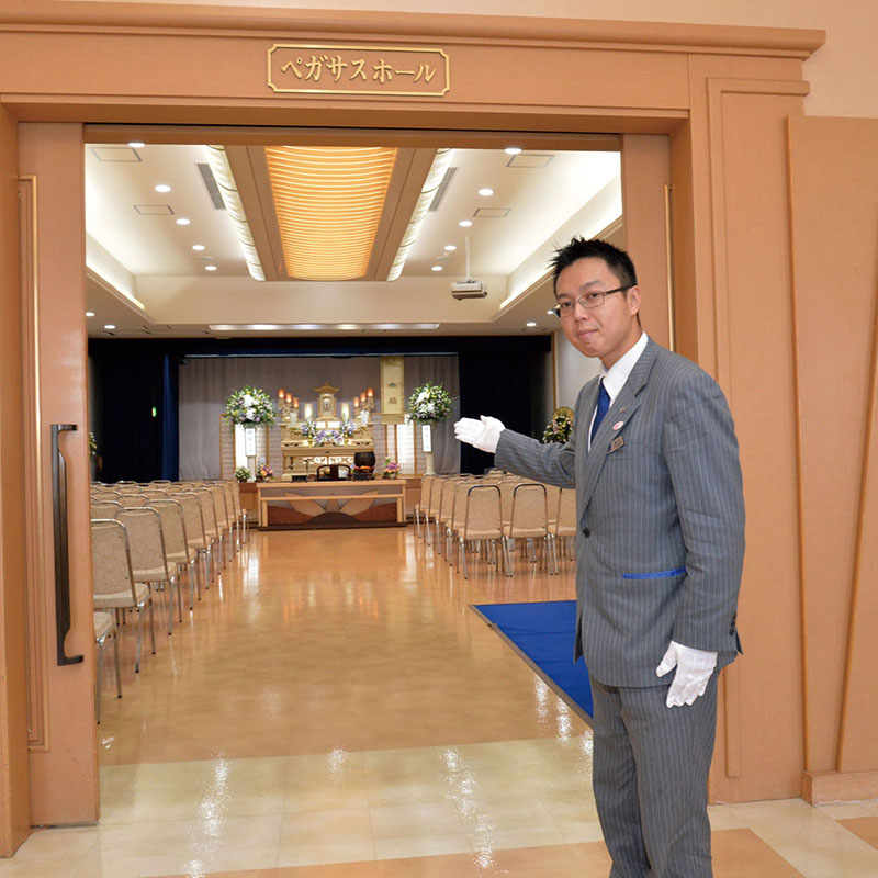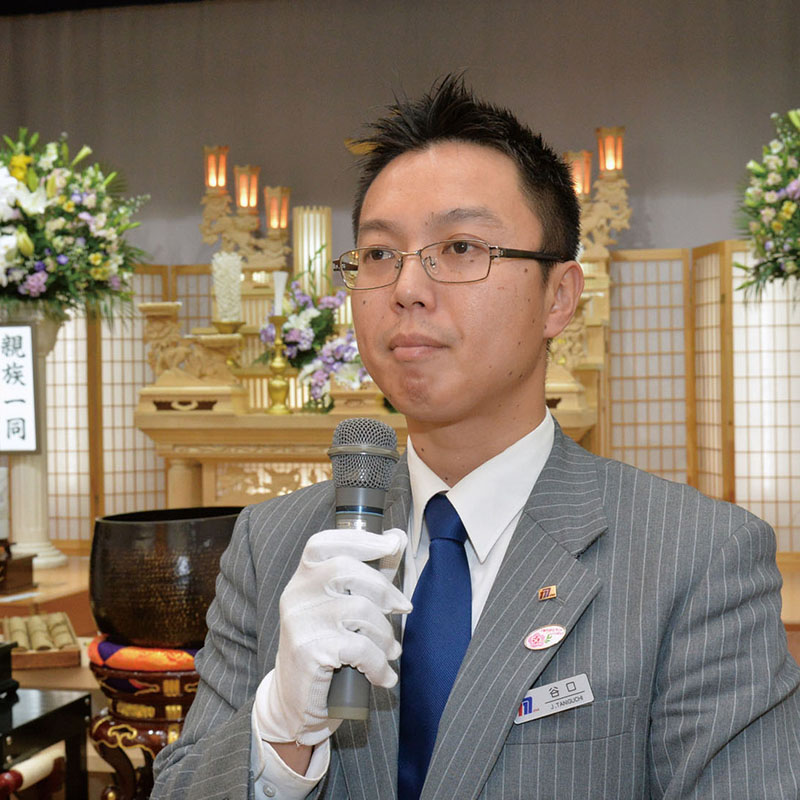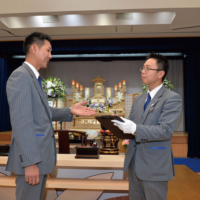 「入社当初は、葬儀の知識もあまりなく、総支配人をはじめ多くの先輩方に色々教えてもらいました。最初にお客様とお話したときは、一杯一杯で、よく覚えていないです」と話す谷口さんですが、現在は社内検定に合格し、打ち合わせや司会業務を担当するまでになりました。