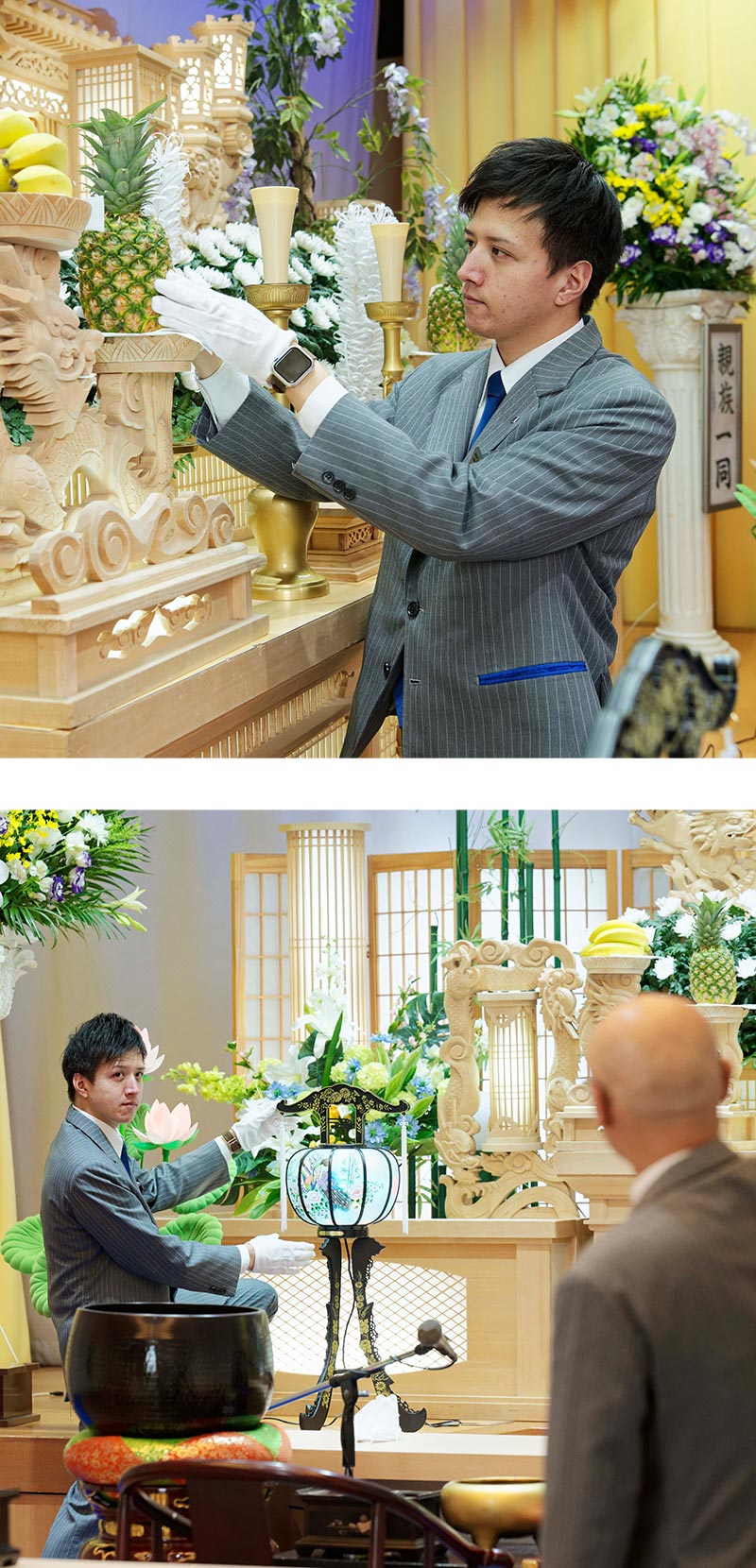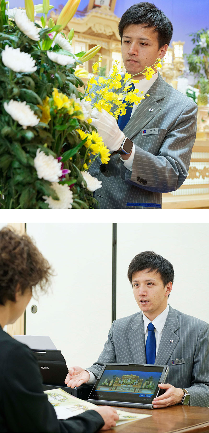 ご葬儀の打ち合せ、祭壇・生花装飾など、ご葬儀が執り行われるまでのすべての業務に携わり、その一つひとつに対する心を込めた対応が評価されています。