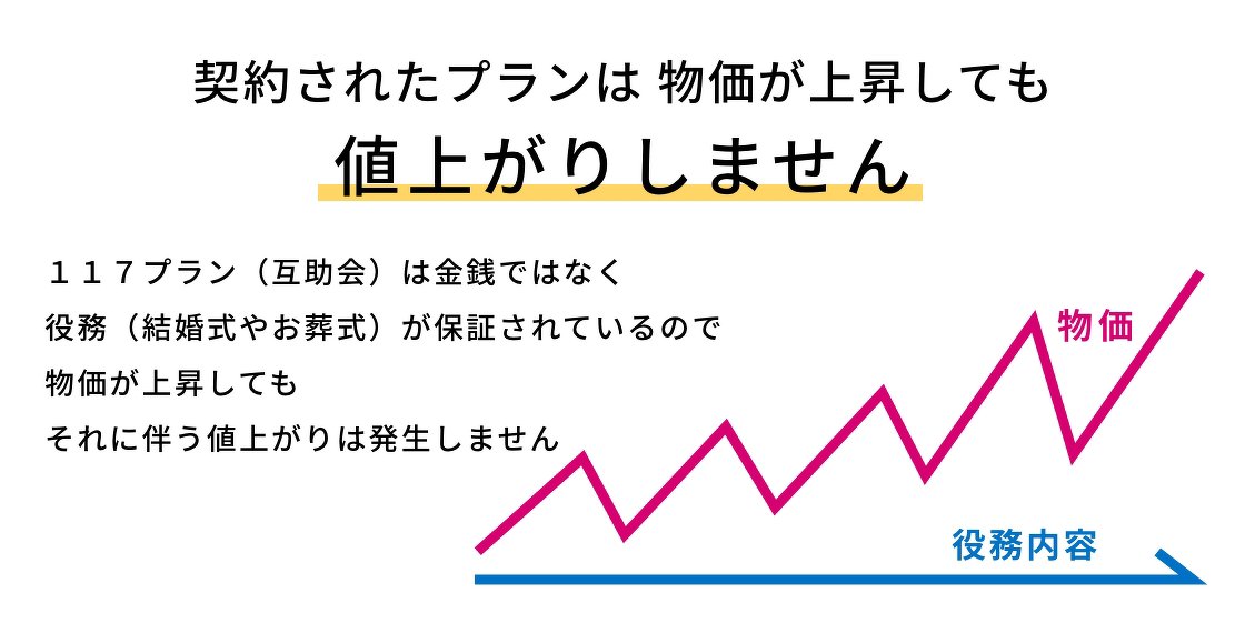 117プラン(互助会)は金銭ではなく、役務(結婚式やお葬式)が保証されているので、物価が上昇してもそれに伴う値上がりは発生しません