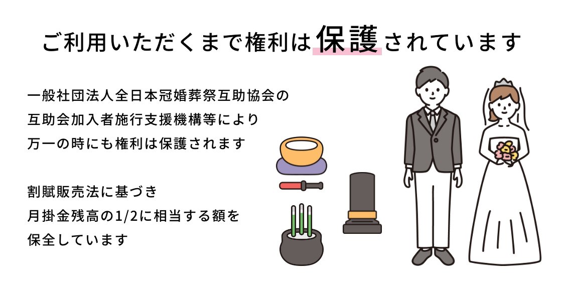 一般社団法人全日本冠婚葬祭互助協会の互助会加入者施行支援機構等により、万一の時にも権利は保護されます