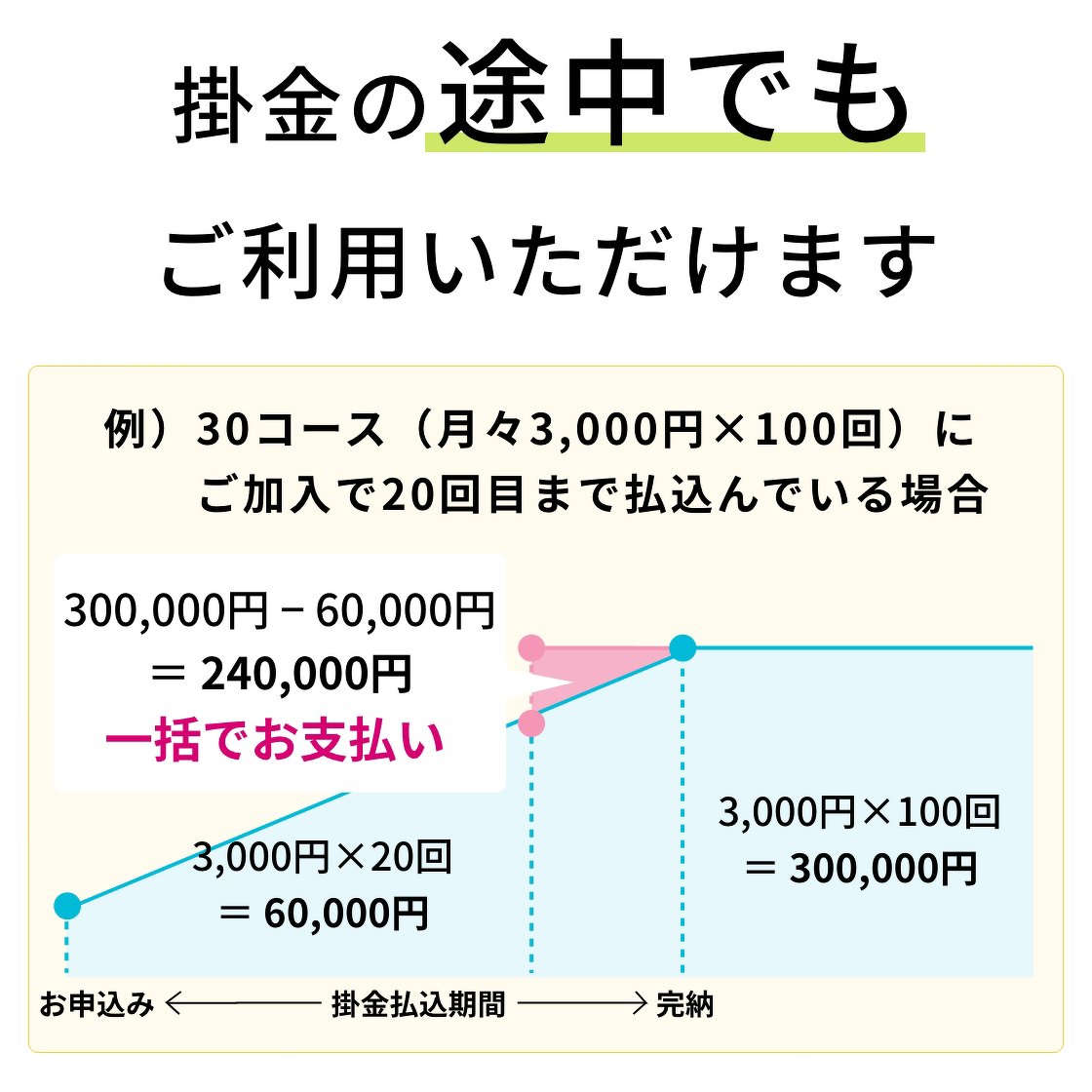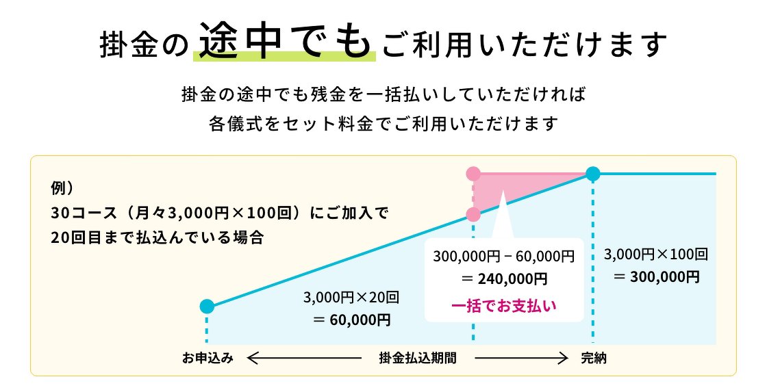 掛金の途中でも残金を一括払いしていただければ各儀式をセット料金でご利用いただけます
