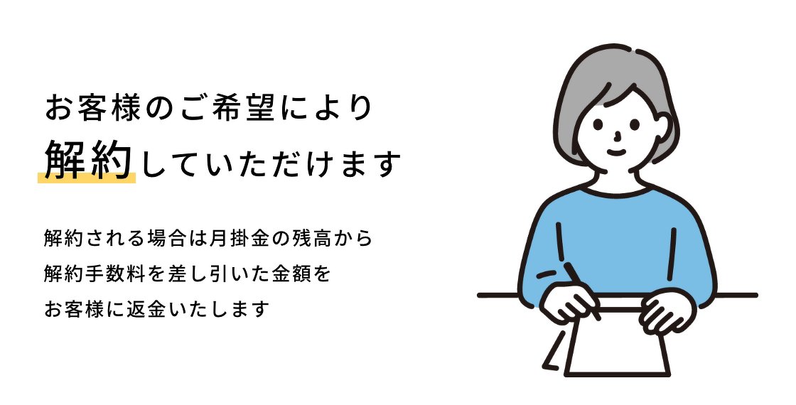 解約される場合は、月掛金の残高から解約手数料を差し引いた金額をお客様に返金いたします