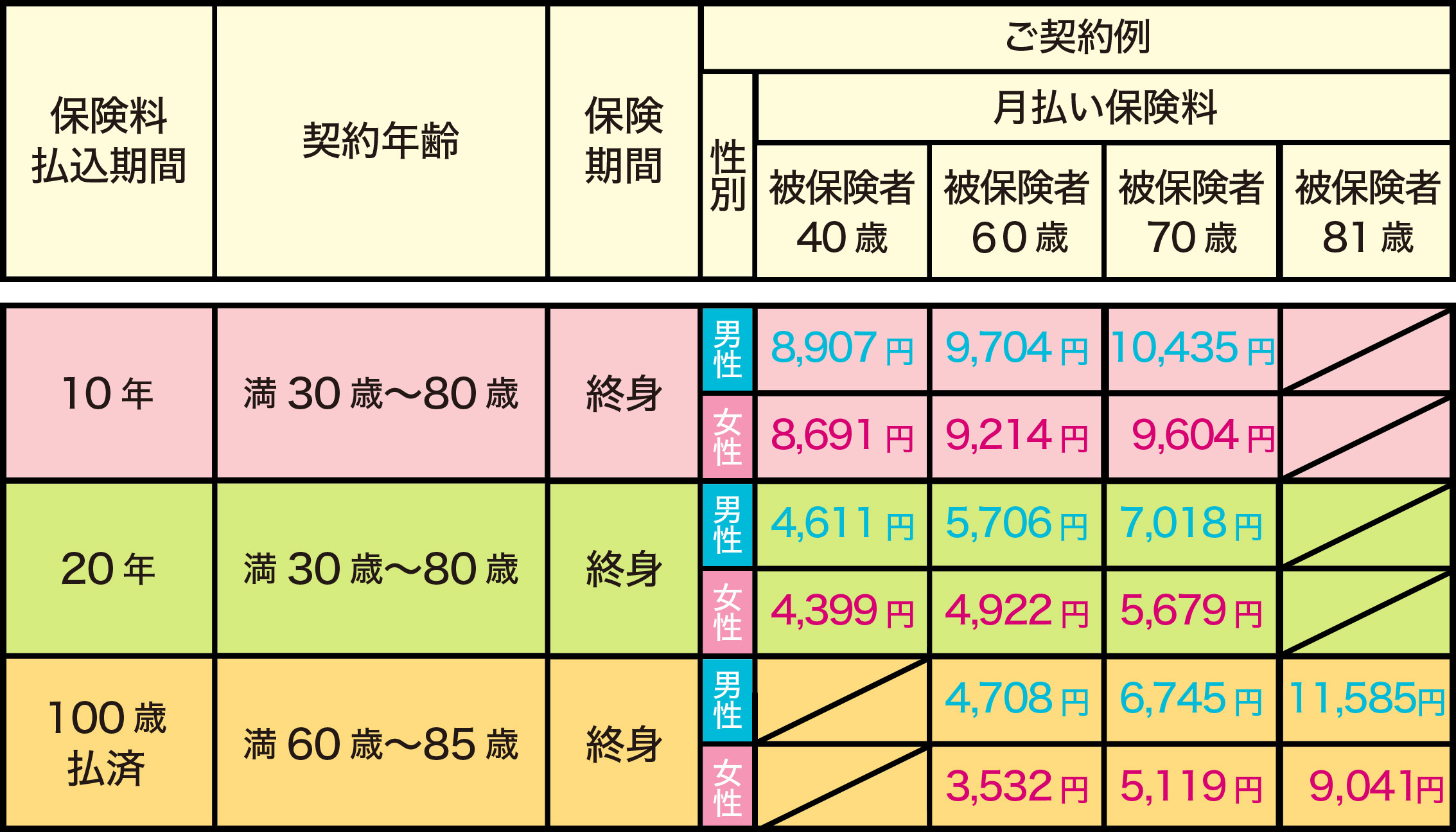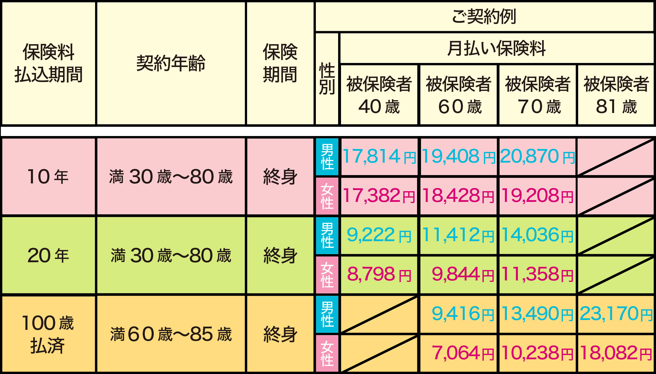 保険料の払込期間は10年・20年、又は100歳まで払いを選べます。保障は一生涯続きます。