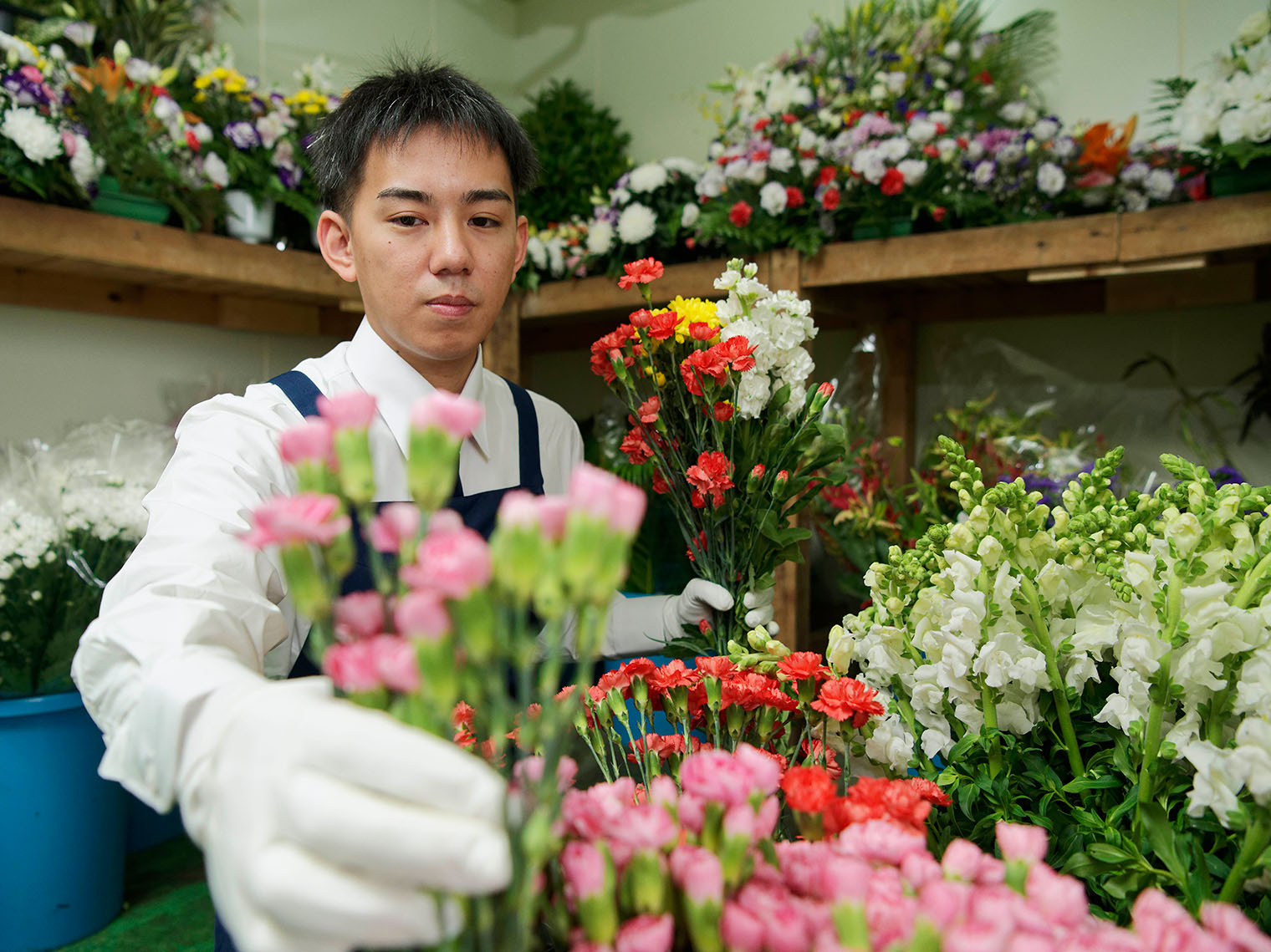 生花の仕入れから管理、供花や、生花祭壇・アレンジ花の作製までをしています。 お客様の要望に応えるため喪家の情報から使用する生花の種類、色彩を精査し祭壇や供花をアレンジしていきます。 生花を使用したオリジナル祭壇の増加とともにますます活躍の場が増えています。故人や遺族の思いを形に変えることができるお仕事です。